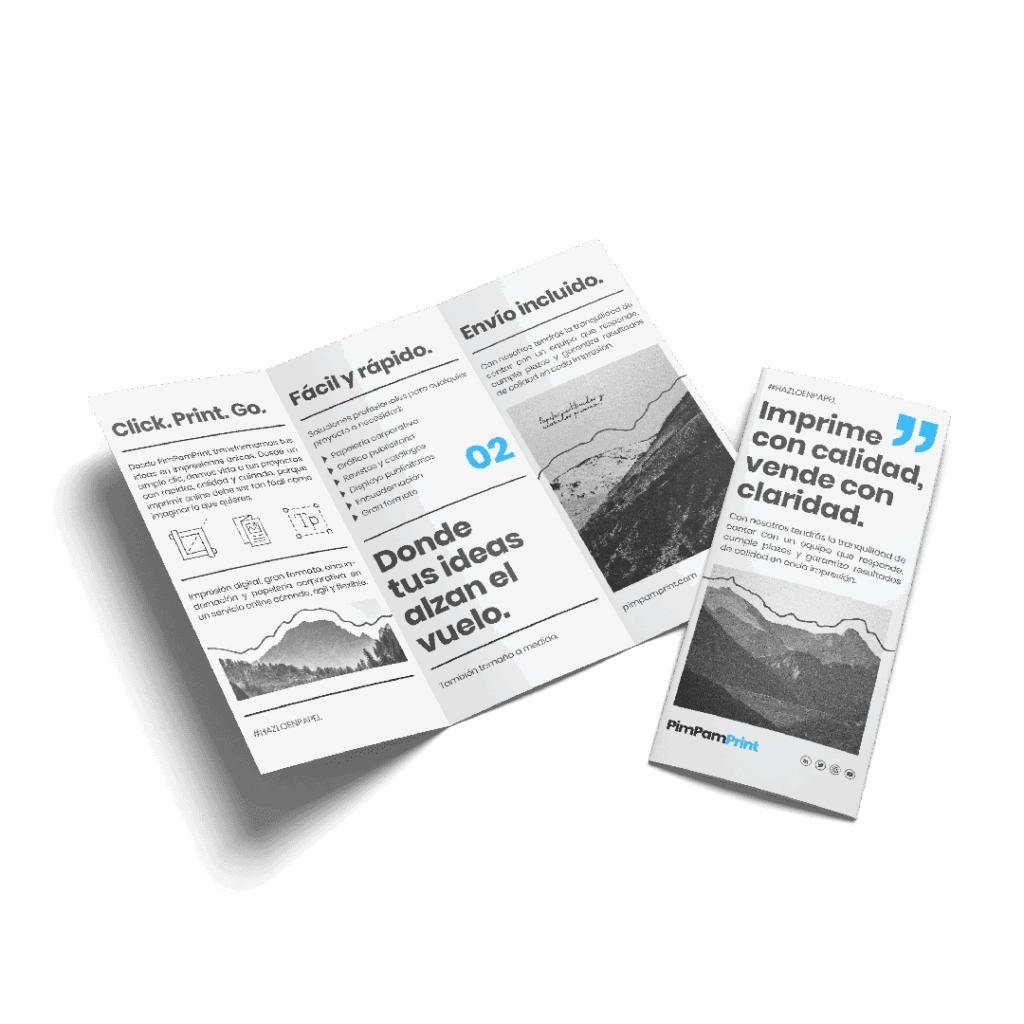 Imprime trípticos personalizados con la mejor calidad y consigue que tu mensaje llegue de forma clara, ordenada y visualmente atractiva. Los trípticos publicitarios son perfectos para presentar información corporativa, menús, productos o servicios de una manera estructurada y profesional. En PimPamPrint puedes elegir entre diferentes formatos (A6, A5 o DL), con impresión en ambas caras y en una amplia variedad de papeles: estucado, offset o reciclado, adaptados a tus necesidades de imagen y presupuesto.